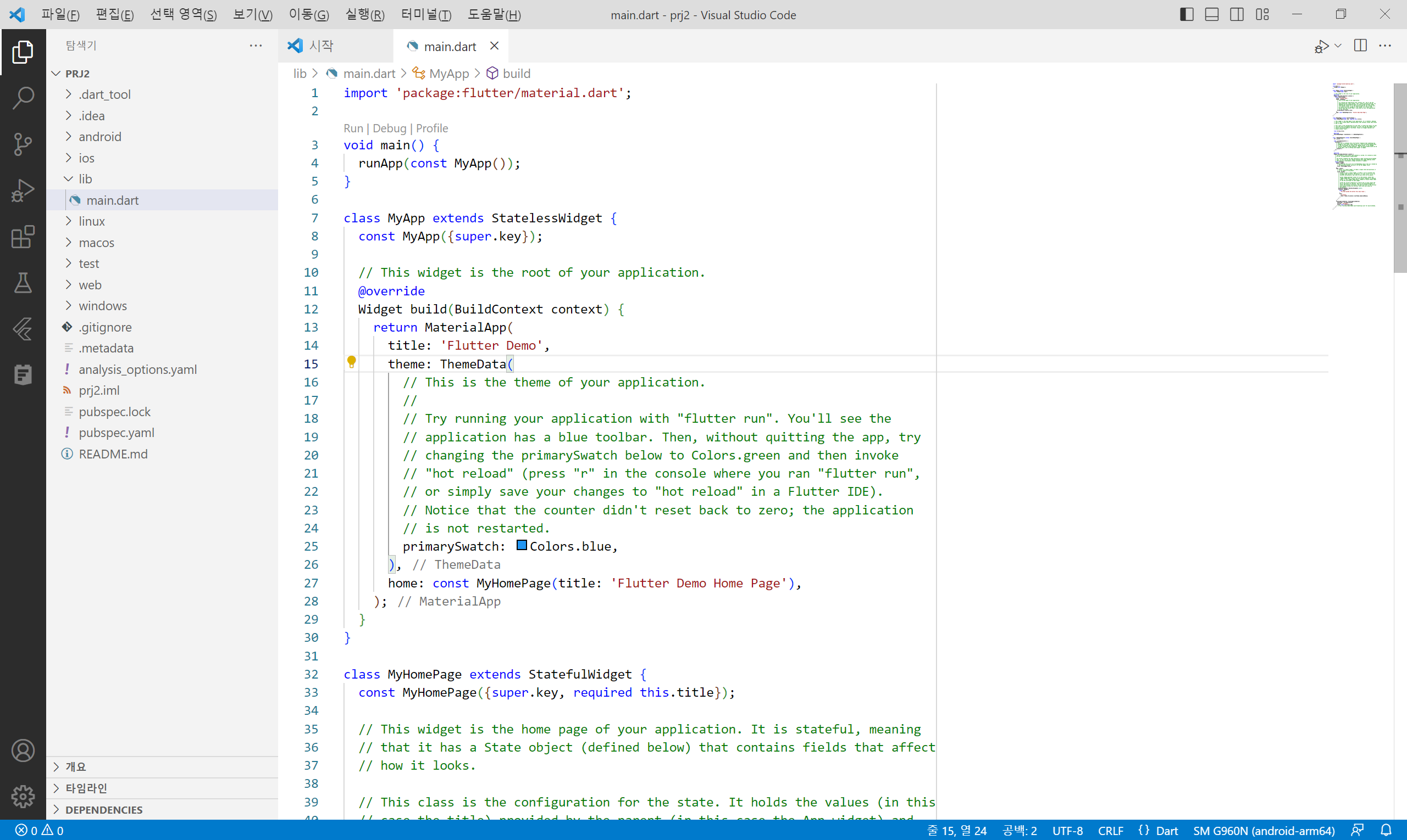 하게되면 기본형태의 플러터 프로젝트를 생성하게 된다.
