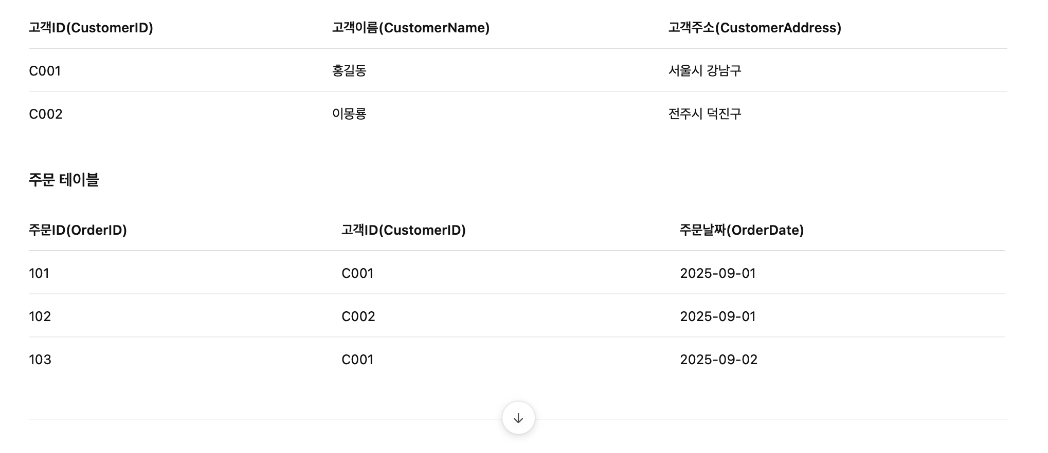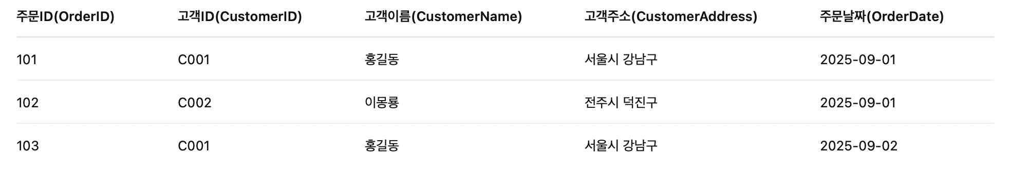 - 예 : 이용자의 전화번호를 2개 이상 받는 경우, 컬럼을 나누어 모바일, 집전화 로 나눠 저장해야 한다.