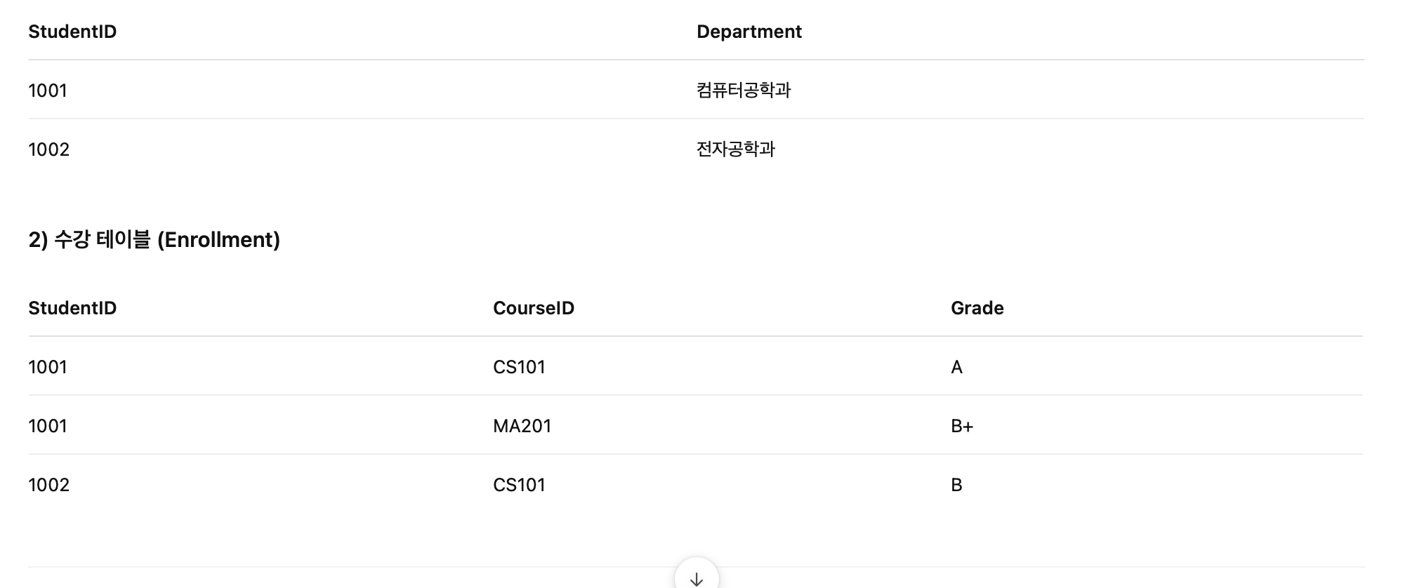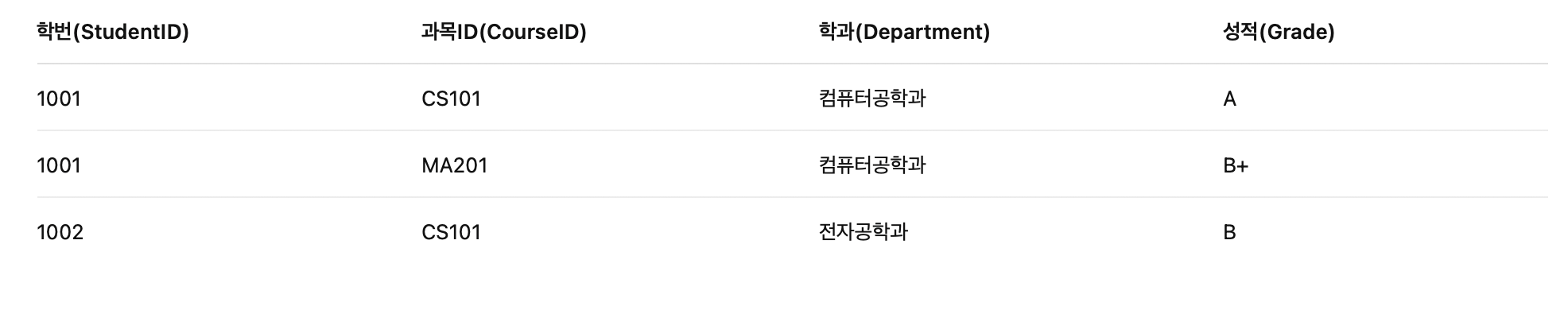 - 예 : 학생ID, 과목ID가 조합키일 경우, 학생 이름, 과목 이름 컬럼이 있게 되면, 한 학생이 다수의 과목을 수강중일때 학생 이름이 중복된다. 또한, 다른 두 학생이 동일한 과목을 수강하면, 과목 이름이 중복 된다.