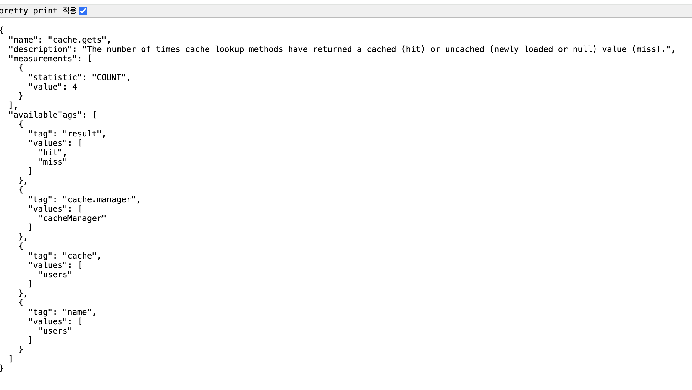 - GET /actuator/metrics/cache.gets 로 요청시 정보를 확인 할 수 있다.