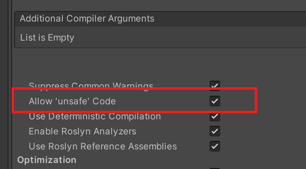 - Player Settings -> Other Settings 최하단부 Allow 'Unsafe' Code 에 체크